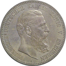 | プロイセン王国・5マルク。フリードリッヒ3世。彼は即位してわずか100日足らずで死去してしまったので、このコインは1年間しか発行されていません。裏面の紋章は小鷲タイプ。ベルリンミント。 |