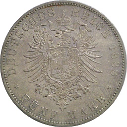 | バイエルン王国・5マルク。ルートヴィッヒ3世。ザクセン王国最後の国王です。ヘッセン大公のルートヴィッヒ3世とは別人です。ミュンヘンミント。 |