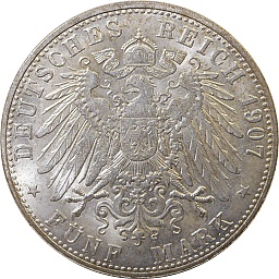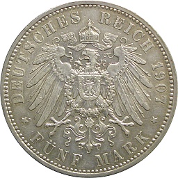 Saxony 5 Mark 1907 E, KM1266, Dav905 Obv. Friedrich Augst III, Rev. Shield |