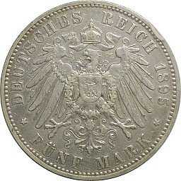 Saxony 5 Mark 1895 E, KM1246, Dav901 Obv. Albert, Rev. Shield |