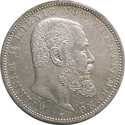 | ヴュルテンベルク王国・5マルク。ウィルヘルム2世。プロイセン王のウィルヘルム2世とは別人です。シュトゥットガルトミント。 |