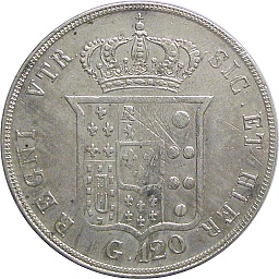 | ナポリ王国&シチリア王国(両シチリア王国)・120グラナ。フェルディナンド2世。額面の120という数字も珍しいですね。裏面のキズはアジャストマークでしょうか。ナポリミント。 |