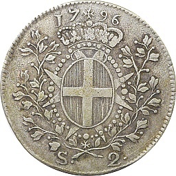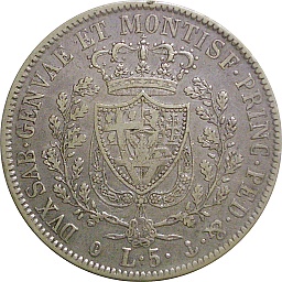 | サルデーニャ王国・5リレ。カルロ・フェリーチェ。サルデーニャ王国の国王です。裏面の紋章は、イタリアのコインの中でも比較的手の込んだ、美しいデザインになっています。ジェノヴァミント。 |