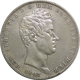 サルデーニャ王国・5リレ。カルロ・アルベルト。このコインが発行された翌年に始まったオーストリアとの戦争に敗北し、後にサルデーニャ王である彼は亡命し、王位を失います。ジェノヴァミント。 |