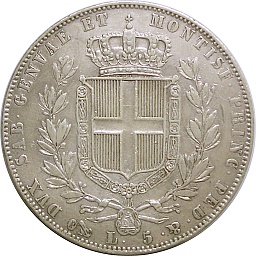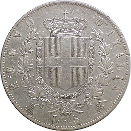 | 5リレ。ヴィットリオ・エマヌエーレ2世。統一後のイタリア王国で初代国王になった人物です。イタリアの大型銀貨の中では、最も入手しやすいコインです。ミラノミント。 |