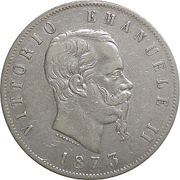 5 Lire 1873 M, KM8.3, Dav140 Obv. Vittorio Emanuele II, Rev. Shield |