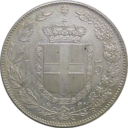 5リレ。ウンベルト1世。このコインは、おそらくオリジナルではないと思います。特年なのに状態が良すぎます。イタリアのコインには非公式の再鋳貨が多いと、何かで読んだ記憶があります。ローマミント。 |