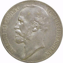 | ターレル。ヨハン2世。オリジナルは、19世紀にこの国で発行された唯一のターレル貨で、発行枚数わずか1920枚の稀少コインとして知られます。幸運にも、裏面にMのミントマークがついた再鋳貨が存在するので、コレクションに加えました。ミュンヘンミント。 | 5クローネ。ヨハン2世。18才でリヒテンシュタインの君主となった人物です。わずか1万5千枚の発行ですが、その割には入手しやすいコインです。同じデザインで1924年に発行された5フランの方は、かなりの量が溶解されていて稀少です。ウイーンミント。 | |||||||