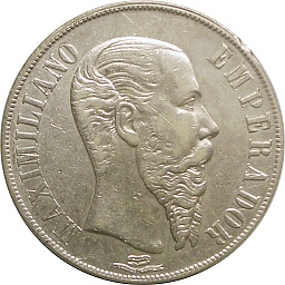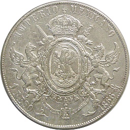 ペソ。マクシミリアン皇帝。オーストリア皇帝のフランツ・ヨーゼフ1世の弟にあたります。即位してわずか3年でメキシコ民主主義勢力に捕らえられ、処刑されてしまいました。メキシコシティミント。 |
