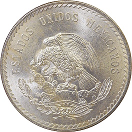 | 5ペソ。クアウテモック。かつてメキシコ中央部に栄えた文明国家アステカの君主の肖像が描かれています。戦後発行の通常貨としては異例な、品位0.900の立派な大型銀貨なので、コレクションに加えました。メキシコシティミント。 |