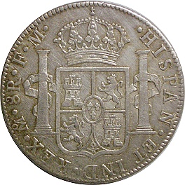 8レアル。カルロス4世。スペインの植民地時代に発行されたコインで、スペイン王の肖像が描かれています。同じデザインのコインが中南米各国で発行されていて、ミントマークで国を見分けます。メキシコシティミント。 |