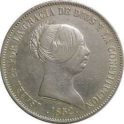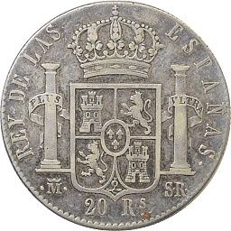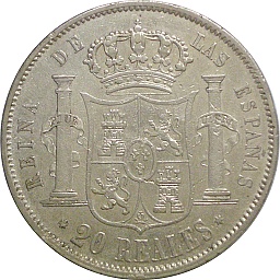 | 20レアル。イサベル2世。彼女は1830年生まれですから、このタイプは25歳位のときの肖像でしょうか。以前の肖像と比べると、少し痩せたみたいですね。マドリッドミント。 |