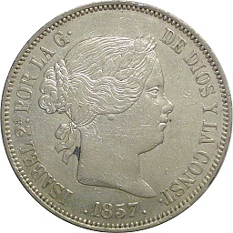 20 Reales 1857, KM609.2, Dav334 Obv. Isabel II, Rev. Shield |