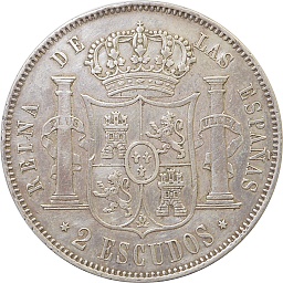 2エスクード。イサベル2世。エスクードは、通貨単位がレアルからペセタに変わる過程で、短期間だけ使用されました。その割に発行枚数は多いので、入手は容易です。マドリッドミント。 |
