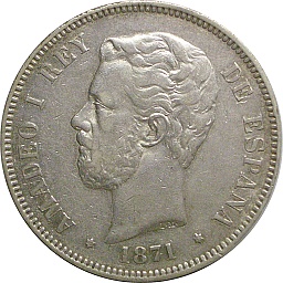 | 5ペセタ。アマディオ1世。革命の6年間と呼ばれる1868年から1874年にかけてのスペイン激動の時代に、わずか2年間、国王になった人物です。マドリッドミント。 |