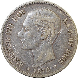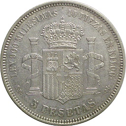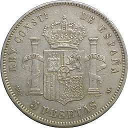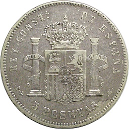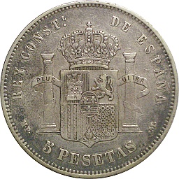 | 5ペセタ。アルフォンソ12世。肖像に変化が見られるとともに、銘文が "REY DE ESPANA"(スペイン王)から "POR LA G DE DIOS"(神の御加護による)に変化しています。マドリッドミント。 |