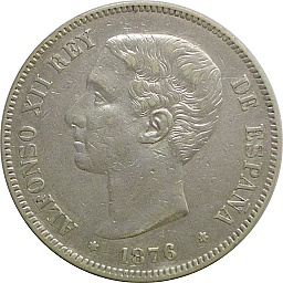 5ペセタ。アルフォンソ12世。王政復古によって、1874年から約10年間、スペインの歴史の中では比較的平穏な時代に国王になった人物です。マドリッドミント。 |