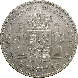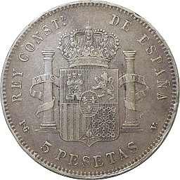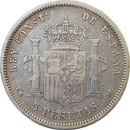 5ペセタ。アルフォンソ12世。ヒゲが生えました。裏面にはスペインの紋章、王政を示す王冠、そしてギリシャ神話に登場するヘラクレスの2本の柱が描かれています。マドリッドミント。 |