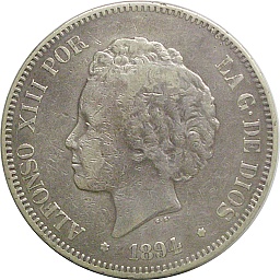 5 Pesetas 1894 PG-V, KM700, Dav343 Obv. Alfonso XIII, Rev. Shield |